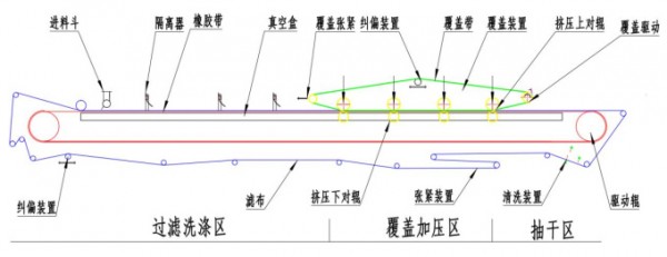 履帶式真空壓榨脫水機由履帶覆蓋裝置、橡膠濾帶、真空箱、驅(qū)動輥、膠帶支承臺、進料斗、濾布糾偏裝置、驅(qū)動裝置、濾布洗滌裝置、對輥壓榨、機架等部件組成。它是充分利用物料重力、真空吸力、雙濾布擠壓和對輥壓榨實現(xiàn)固液分離的效率很高的設備。