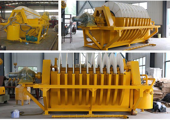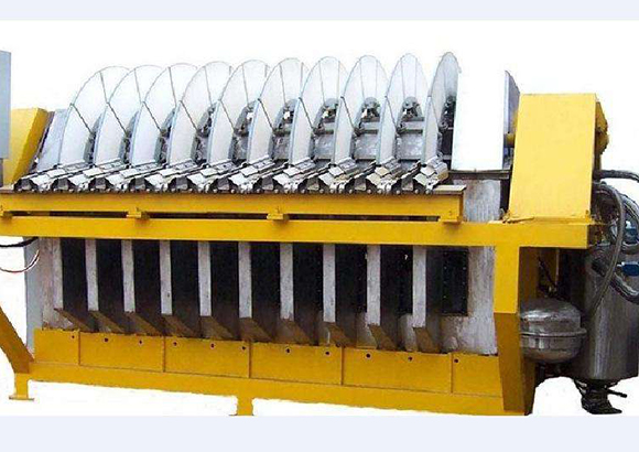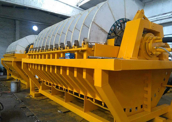 其結(jié)構(gòu)主要包括:裝有若干組陶瓷過(guò)濾板圓盤(pán)而形成的轉(zhuǎn)子,產(chǎn)生自耦切換現(xiàn)象的抽吸和沖洗作用的分配頭、防止固體沉淀的攪拌器、消除過(guò)濾板吸附固體所需的刮刀,對(duì)過(guò)濾板腹腔內(nèi)部向外沖洗及超聲波振蕩的清洗系統(tǒng),保持一定漿料液位的槽體和運(yùn)行程序控制系統(tǒng)。過(guò)濾機(jī)運(yùn)轉(zhuǎn)時(shí),過(guò)濾板由于抽真空的作用,當(dāng)轉(zhuǎn)動(dòng)浸沒(méi)在槽內(nèi)的漿料液面下,使過(guò)濾板表面形成一層固體顆粒堆積層,液體通過(guò)了過(guò)濾板由分配頭切換進(jìn)入真空桶。