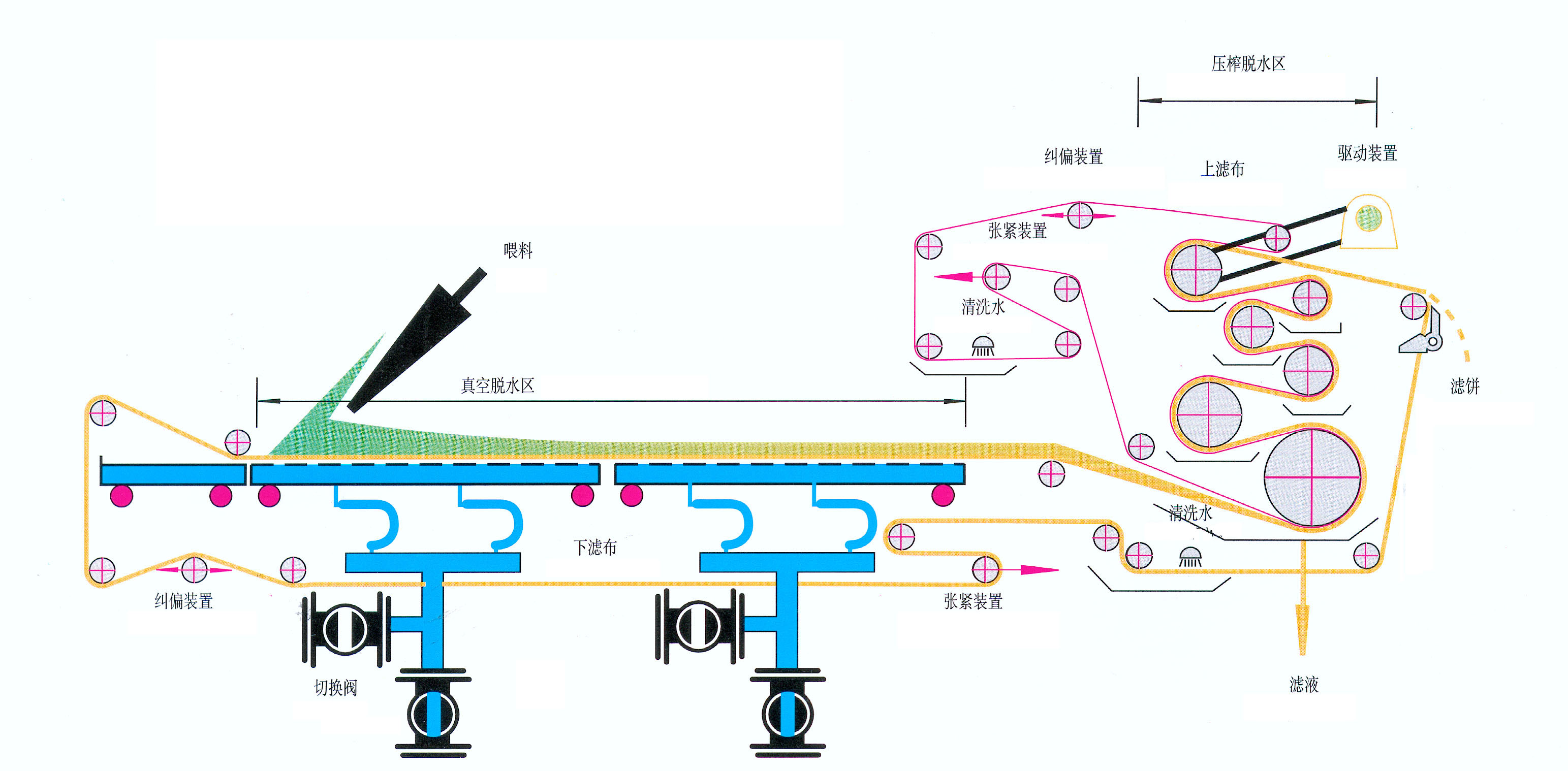 真空帶式壓濾機是我公司原創(chuàng)的一種新型壓濾設備。其以特質濾布作為過濾介質,依靠真空吸力結合高壓脫水區(qū),通過滾簡與濾布反復擠壓和剪切,較大限度的除去濾餅水份的過濾分離設備。適用于工業(yè)過濾,污泥等各種粘細物料的脫水。該機適用于所有場合,且生產(chǎn)能力大30-50%,濾餅含水率小5-8%;適用于需洗滌的可壓縮性、細粘物料的脫水。
